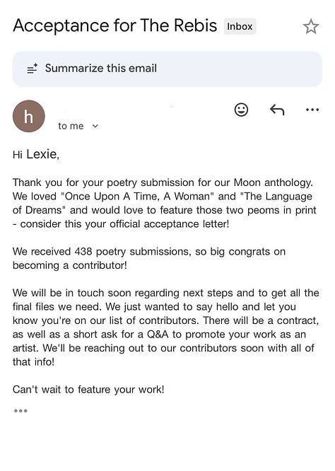 The Rebis feels free, intuitive, and honest. It’s spiritual and magic and tarot themed. I thumbed through the pages of previous issues and thought what an honor it would be to see my work there. And now it’s happening! My poems will be printed in the upcoming issue titled, “The Moon.”